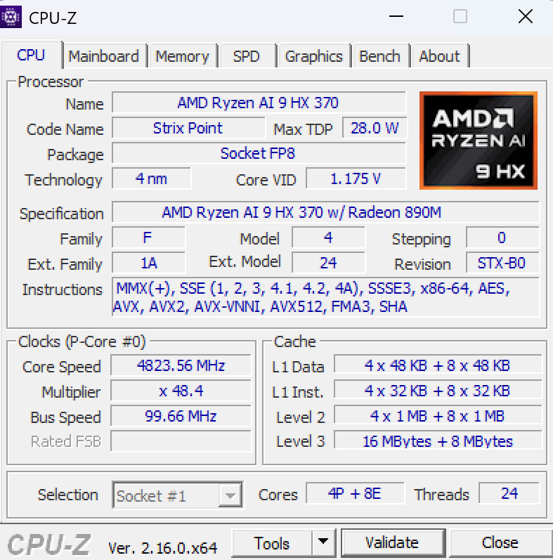 El cerebro de la máquina, un potente AMD Ryzen AI 9 HX 370 de 4 nm, que cuenta con un TDP máximo de 28W, 12 núcleos capaz de aguantar hasta 24 subprocesos al mismo tiempo. En modo turbo puede llegar a los 5.1 Ghz. Pero este Ryzen viene sobrecargado pues cuenta con su propio modulo gráfico, concretamente con una Radeon 890M con una frecuencia máxima de 2900 MHz y posibilidad de mover contenido (video) a resoluciones muy altas.
