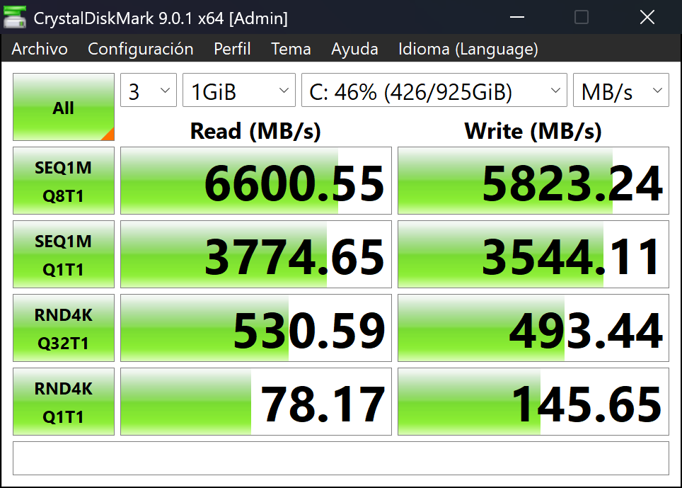 Incorpora un SSD interno conectado al puerto PCie 4.0 de un 1TB M.2 NVMe, al que le hemos un test de velocidad respondiendo de manera muy aceptable: