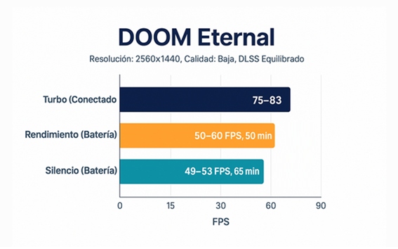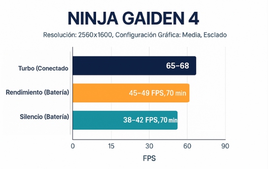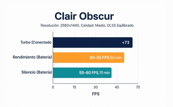 Una vez más las pruebas nos confirman que tenemos todo lo necesario para exigirle mucho a este portátil y nos ponemos a ellos sobre juegos reales. Hemos seleccionado para nuestra prueba Clair Obscur: Expedition 33 donde los FPS son vitales para hacer buenos “parry” por otro lado Doom Eternal y Ninja Gaiden 4 también tienen una importancia alta en cuanto a FPS pero cuentan con una carga grafica importante que requerirá más uso de batería.