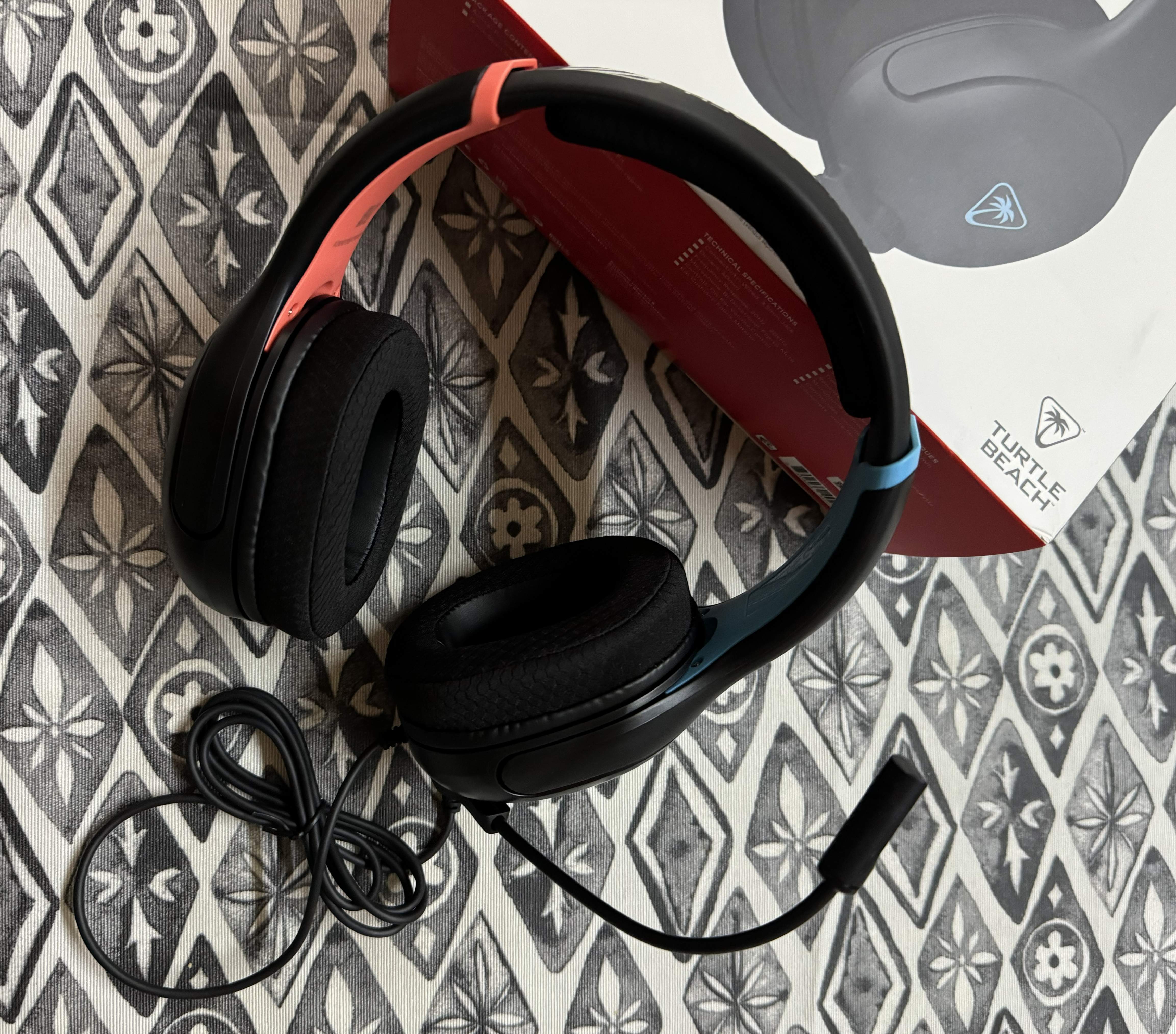 El diseño de los Turtle Beach Airlite Fit es bastante distintivo, con un predominante color negro que les confiere una apariencia elegante y sobria. A esto se suman toques de color que rompen la monotonía: detalles en rojo vibrante y azul eléctrico que les dan un aire gamer. En el lateral de la diadema, en blanco, podemos ver la inscripción "Switch 2", que, aunque hace referencia a la nueva revisión de la consola, los auriculares son compatibles con toda la familia Switch. Por supuesto, el icónico logo de Turtle Beach no podía faltar, luciendo en los propios cascos y reafirmando la marca. Son robustos, y no dan la sensación de que se vayan a desmontar a la primera de cambio. Los materiales parecen de calidad, aguantarán bien el trote diario y los viajes en la mochila.