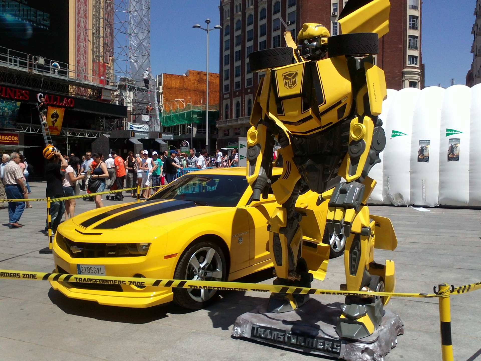 Activision nos ha invitado a la céntrica plaza de Callao, en plena capital madrileña para presentarnos el videojuego oficial de Transformers el lado oscuro de la Luna al mismo tiempo de arrancar el tour de Transformers por toda España. Al llegar allí se encontraba un caminión que no podría ser otro que Optimus Prime, espectacular. Pero también estaba en Chevrolet Camaro SS real, aunque también estaba su forma de transformer conocido como Bumblebee con su característico color amarillo.