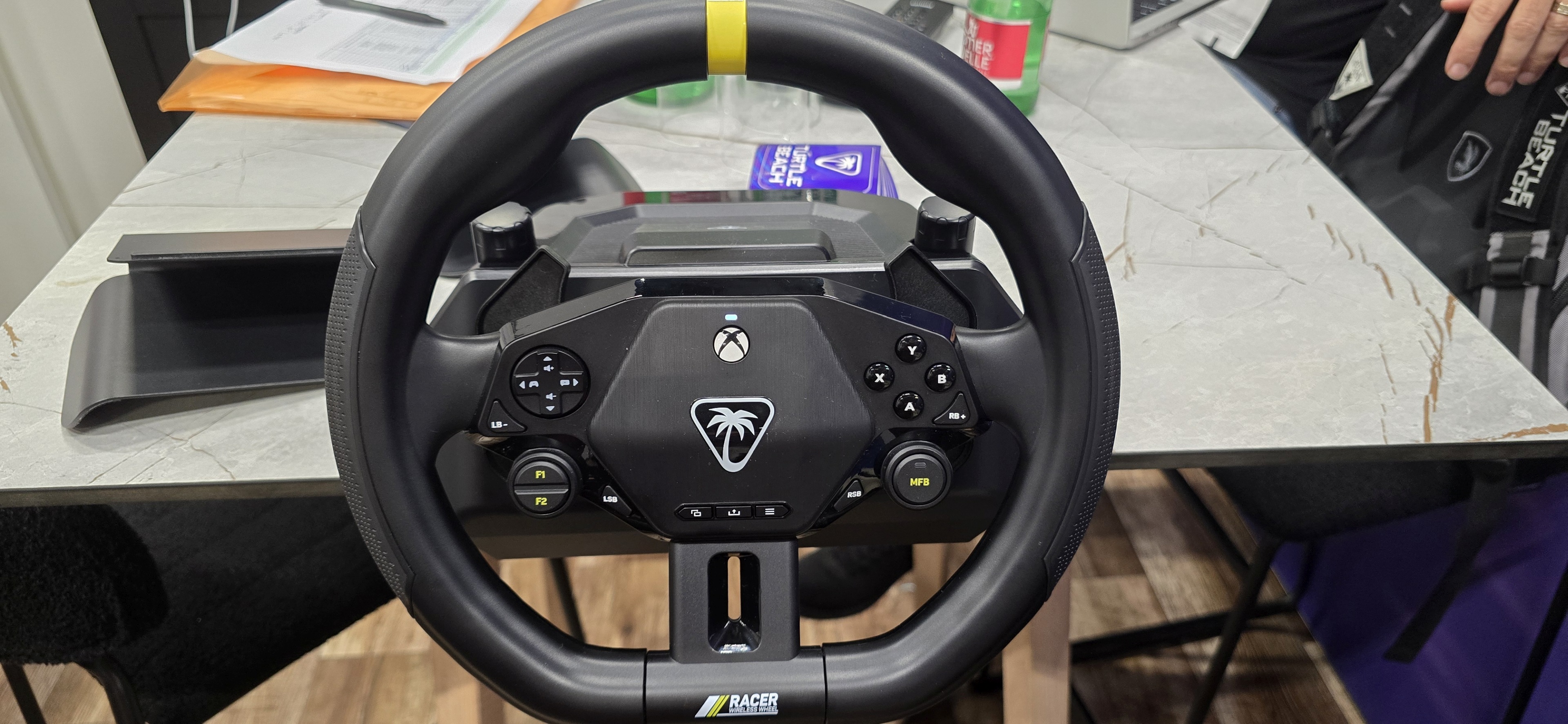 Este fue el paso final antes de marcharnos de la presentación y fue poder probar de primera mano el volante premium de simulación de Turtle Beach: el VelocityOne Race KD3. Estamos hablando de un volante + pedales personalizados de la marca de Microsoft que cuenta con motor Direct Drive de 3,2 Nm, pantalla integrada para hacer configuraciones en el momento. Mola y se agradece. Os aseguro que una carrera al Forza con este set es otra historia. El volante puede cambiarse por el F-RX Formula Wheel, es decir, un volante totalmente del estilo de F1 con iluminación en botones y paletas magnéticas, muy chulo y recomendado para entusiastas de la F1. Los precios son de 349,99 € para el set de VelocityOne KD3 y 199,99 € para el F-RX Formula Wheel.