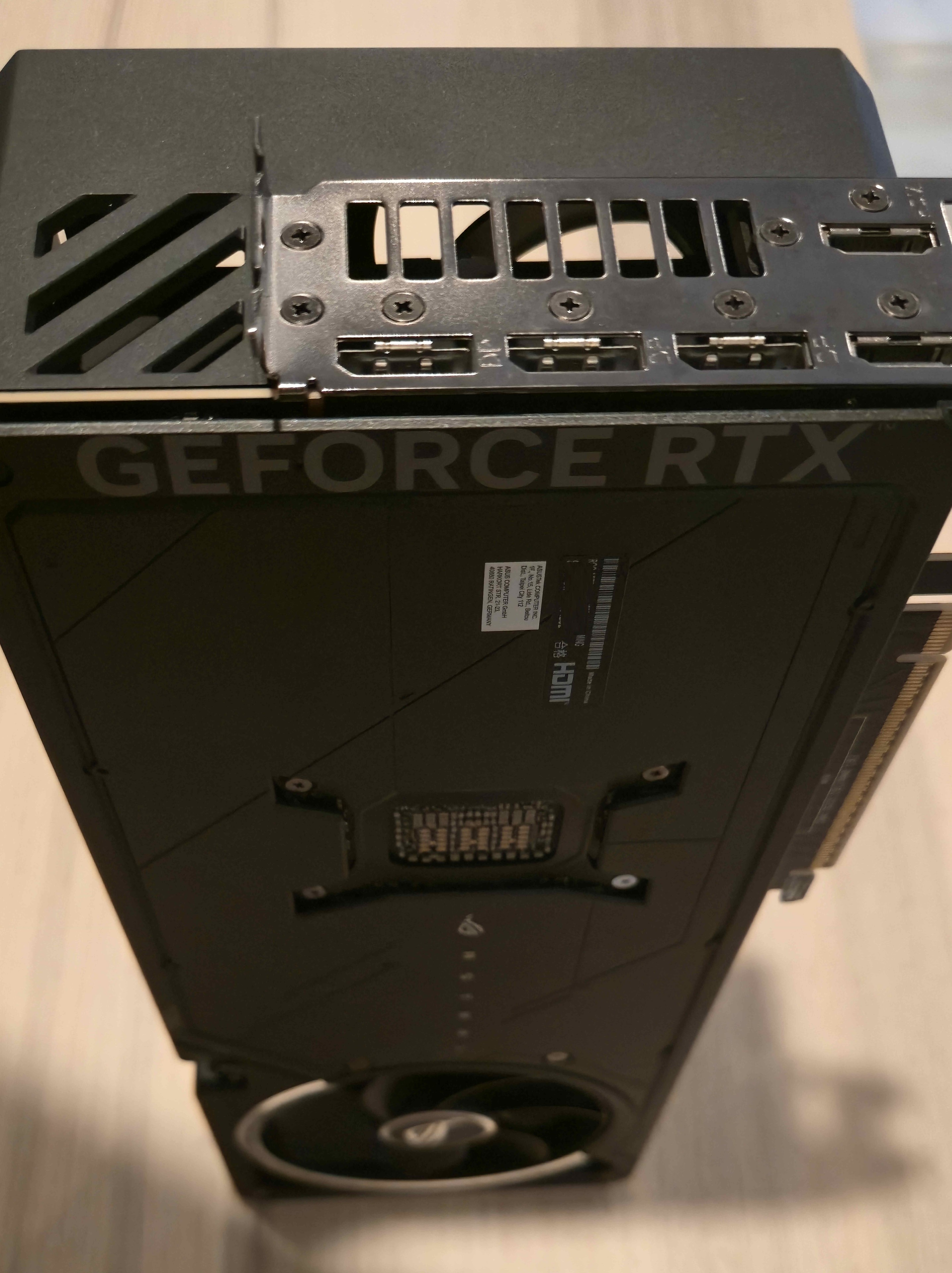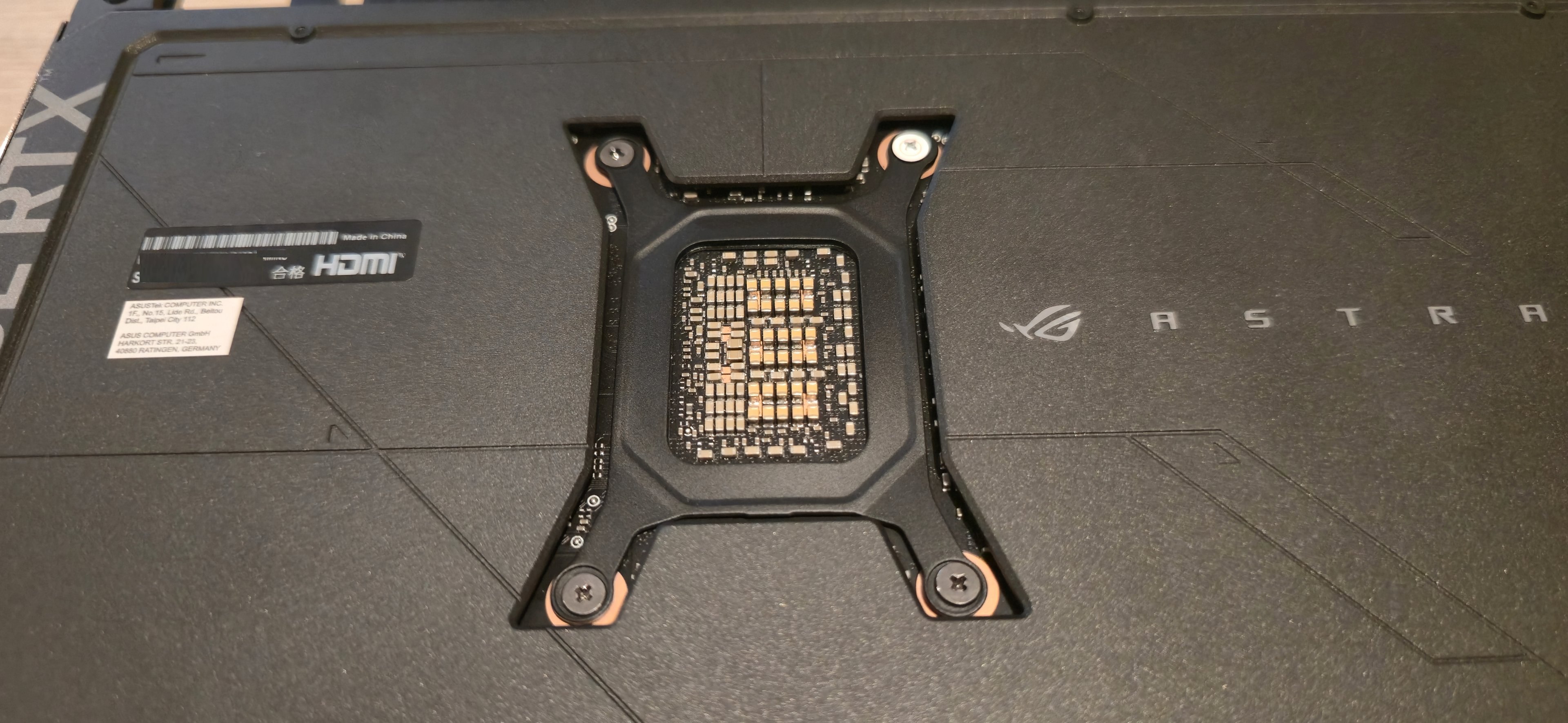 El chasis es súper importante y la ROG Astral 5080 destaca por ser una tarjeta grande y pesada, necesitando sí o sí un refuerzo para evitar daños en el PCIe. Pero es por algo importante disipación. Todo ese chasis envuelve lo que hemos visto antes, lo protege y lo hace ser fresco al ser un chasis de metal con un bracket de acero inoxidable en el I/O. Cuenta además con refuerzos GPU Guard para repartir la presión y evitar cualquier riesgo en el montaje. Y si estás en zonas de alta humedad el PCB está recubierto con una protección contra humedad y polvo.