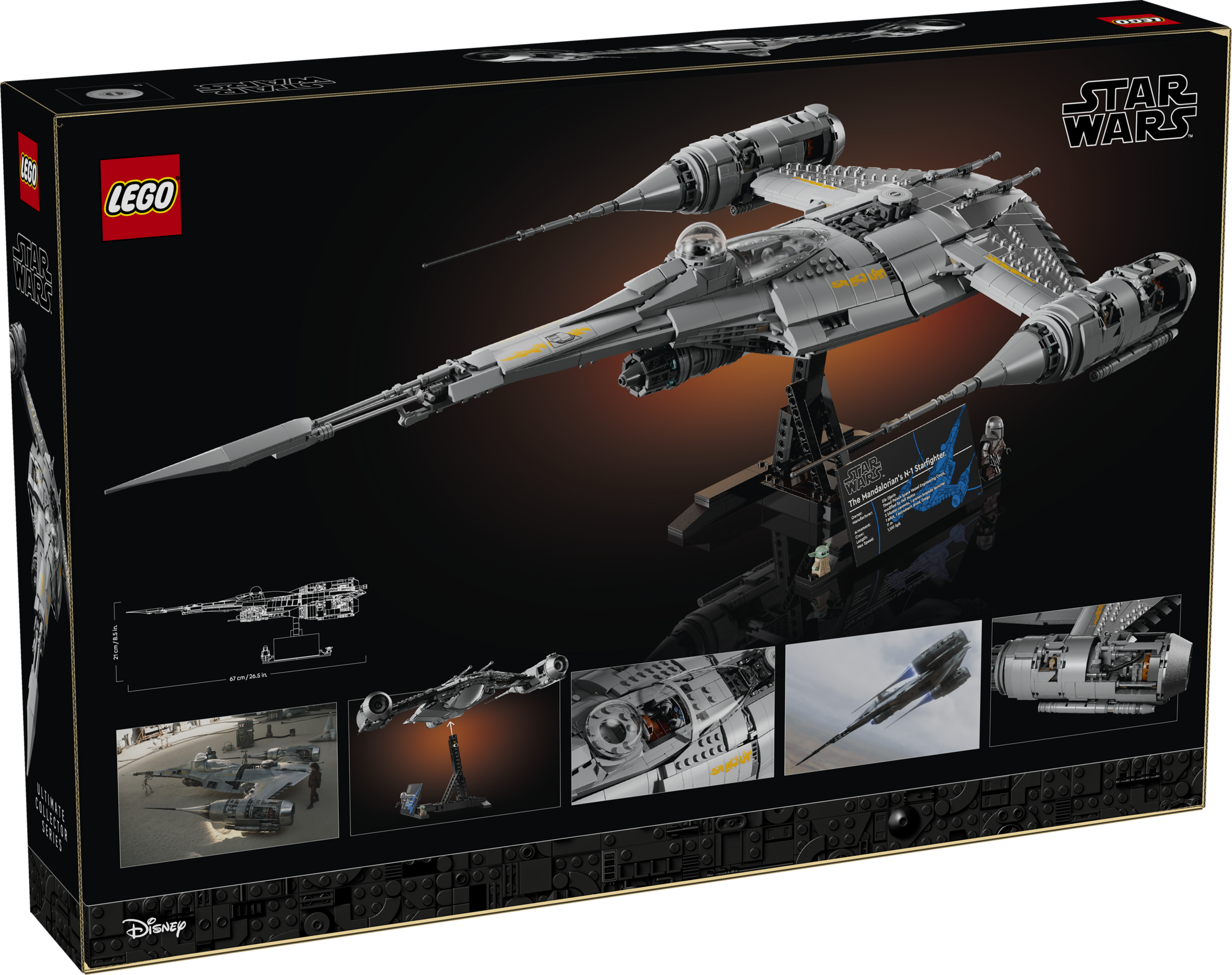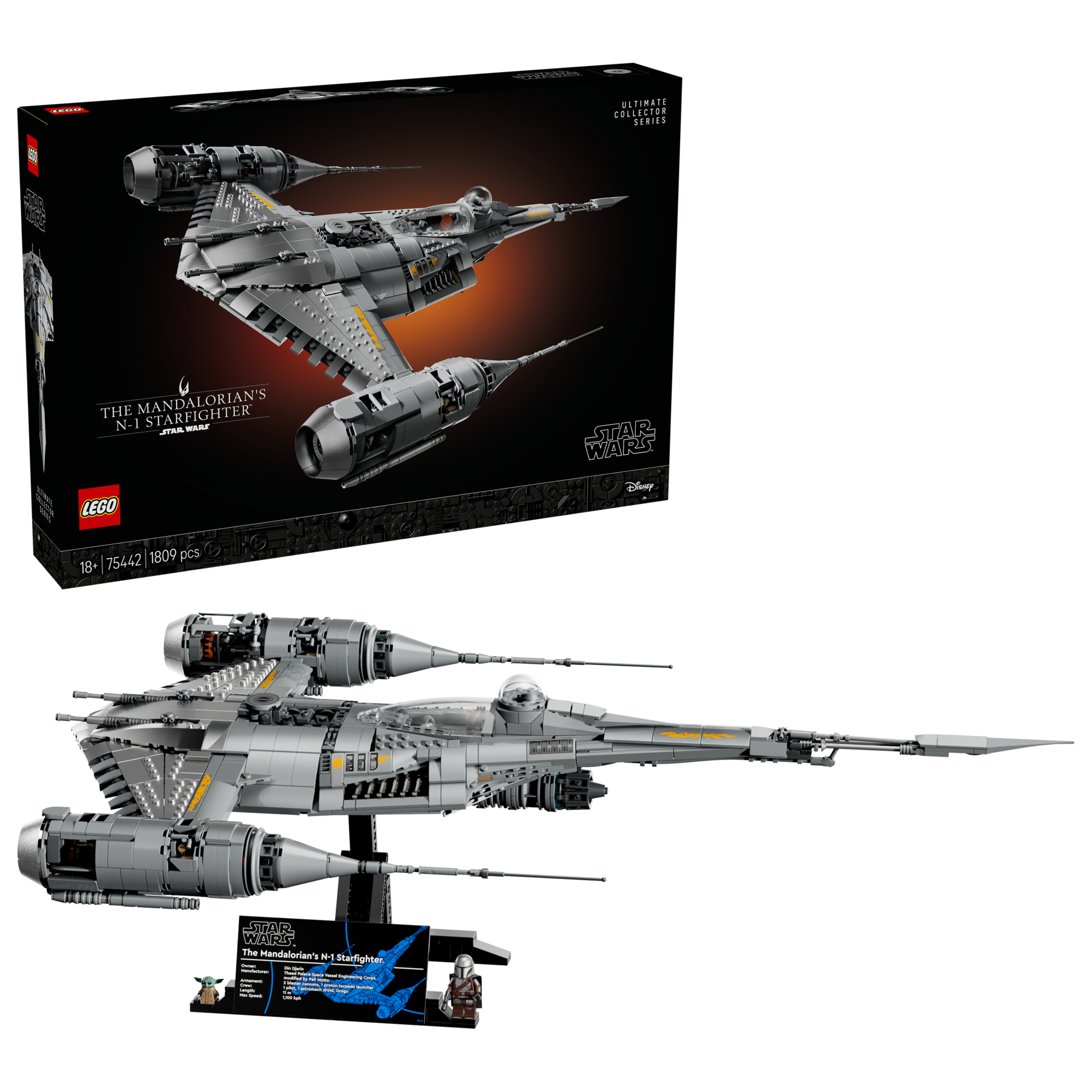 El set incluye una minifigura de The Mandalorian con pistola bláster y una figura de Grogu. Una vez montado, podrá exhibirse sobre una base con placa informativa, permitiendo colocarlo en posición lateral o frontal.
