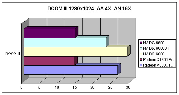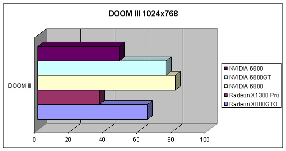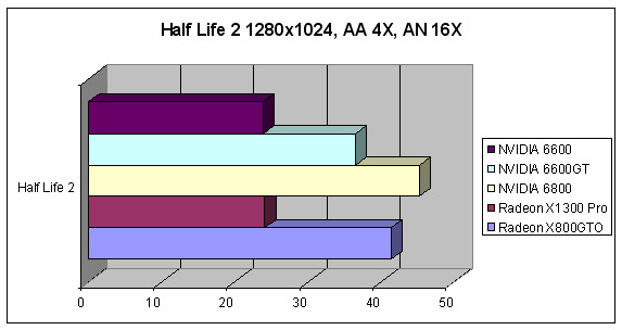 En la gama alta la X800 GTO es capaz de aguantar a la más cara NVIDIA 6800. En la gama baja el X1300 destaca a baja resolución, aunque la NVIDIA 6600GT la supera con los efectos a tope (recordemos que es un poco más cara).