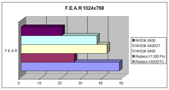 En F.E.A.R la ventaja de las ATI es total, incluso la X1300 es capaz de aguantar el tipo ante la 6600 GT en alta resolución.