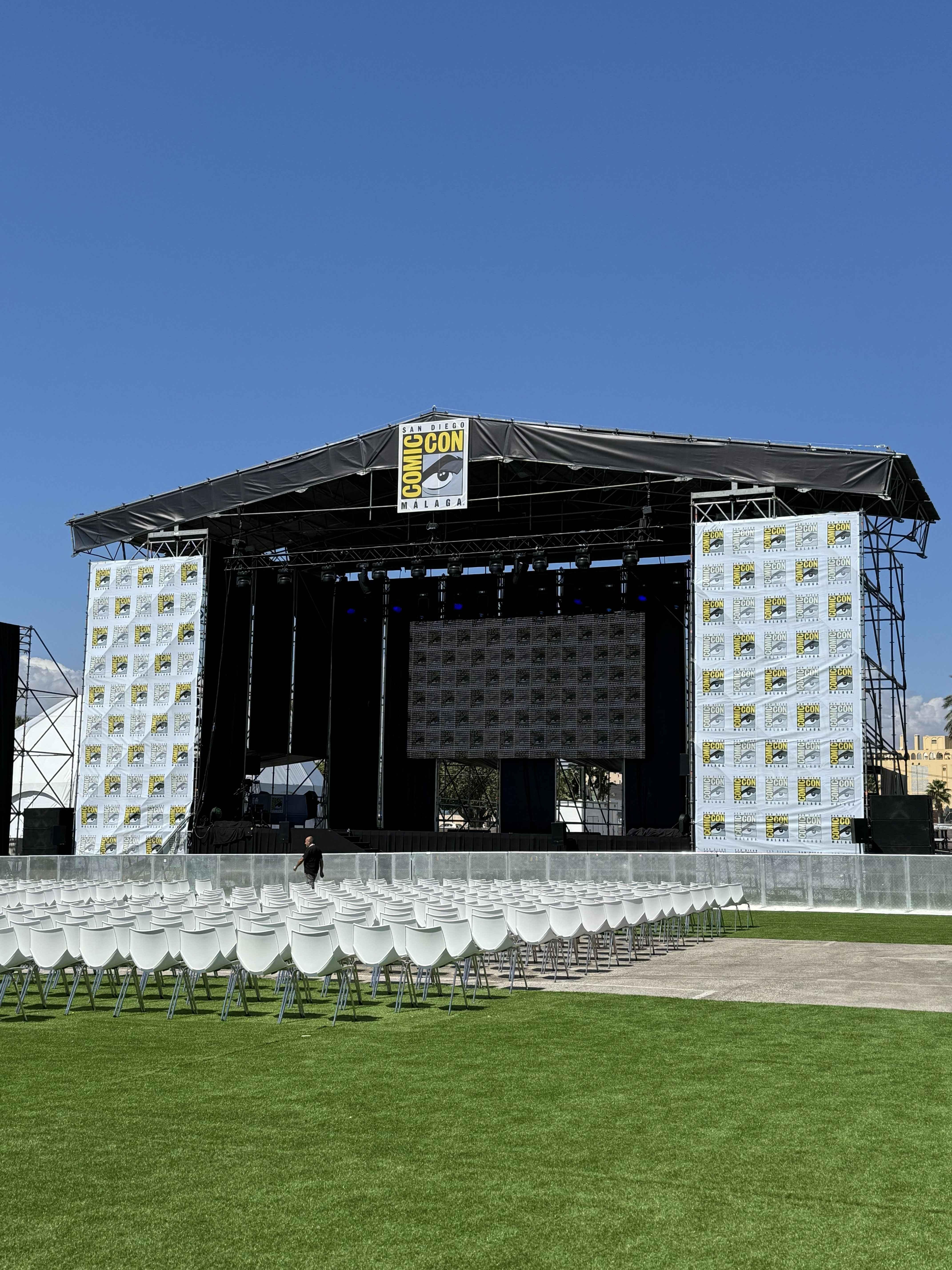 Y luego estaba el exterior. Al salir del pabellón, la primera impresión era de amplitud. Un mar de césped artificial se extendía ante nosotros... y ya. Era un espacio gigantesco, pero desaprovechado hasta niveles absurdos, donde dos lonas gigantes se convertían en el único y codiciado refugio contra el sol de justicia andaluz.