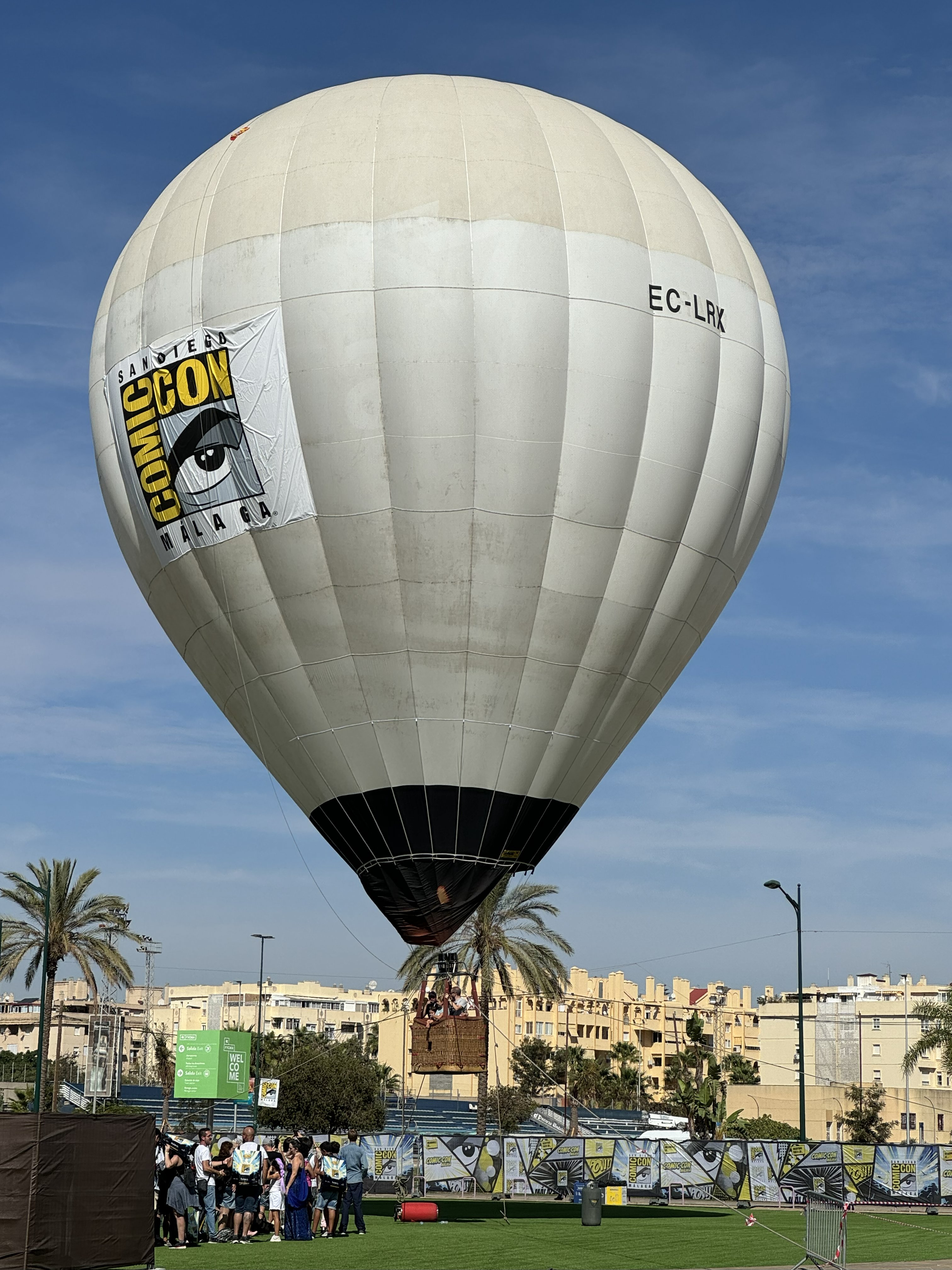 Al fondo, un escenario cumplía una función vital, casi de servicio público: retransmitir en directo los paneles del Hall M. Era el premio de consolación para los miles de personas que se quedaban fuera. Aparte de eso, la oferta era desoladora: unas pocas casetas de venta que parecían sacadas de un mercadillo navideño, la zona de comida con precios de atraco, un arco decorativo y un Goku gigante para la foto de rigor. ¿Actividades? Un simulador de paracaidismo (básicamente, una turbina que te hacía flotar), un simulador de montaña rusa de los amigos de Virtual Family y un globo aerostático que tenía más vocación de ancla que de nave, pasando más tiempo en tierra que en el aire por culpa del viento.